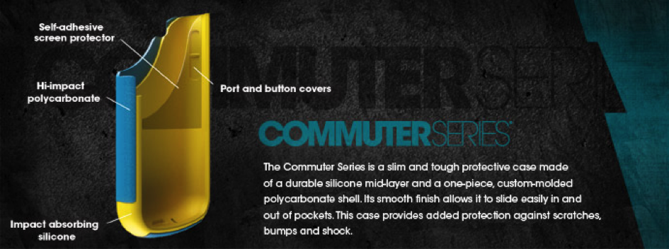 Dalším pouzdrem je Commuter . Toto pouzdro se skládá ze dvou částí . Silikon Vám zakryje celé tělo iPhonu včetně výstupu na sluchátka tak i dock konektoru . Samozřejmě lze tyto výstupy kdykoli otevřít. Na Silikon se dále nasazuje polycarbonový kryt , který celý telefon zpevní . Díky jemnému přesahu na display je zaručeno , že se sklo nikdy nedotkne podložky na které leží nebo případně spadne . Na obrázku vidíte průřez krytem .